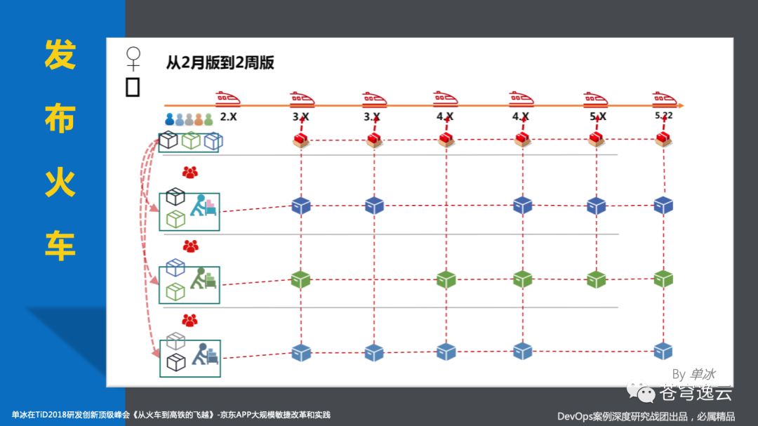 2017年在立杰老师的指导下,单冰老师开始尝试采用版本火车方式进行发布流程的实践,首先固定发布周期,能赶上能测完的需求才会被发布。同年年底,版本火车终于在实现2周一版的固定周期下,实现了将慢车提速至高铁的飞跃。