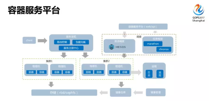 这是我们一个容器服务平台的简单的架构图,基于mesos开发。现在大家做Docker的容器编排服务大部分都是选用Kubernetes,它是基于容器的一整套解决方案,基本上把它部署起来就可以跑容器服务了。