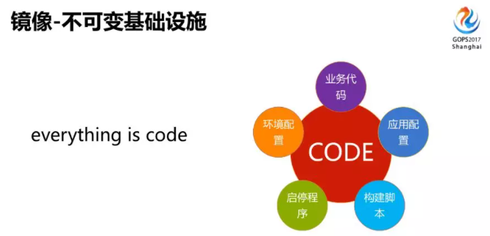 先看镜像,是不可变基础设施的载体,所有东西都认为是代码。除了代码,应用配置,环境配置,包括启动脚本,构建脚本,全都通过版本库管理和版本控制。举例以配置来讲,之前有配置中心集中管理的配置,比如开发测试和生产环境有不同的配置。