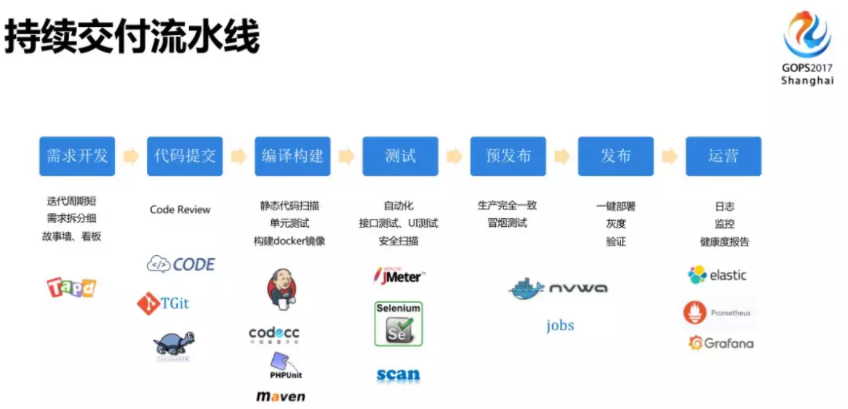 在测试阶段,就是尽可能的引入自动化的测试能力,减少人的参与,接口测试、UI测试逐步覆盖。另外我们还引入安全扫描的机制,在持续交付过程中去提前发现一些安全漏洞的发生。那这些能力也一样是集成公司现有平台的能力,开源也有很多的解决方案。当然我觉得自动化测试阶段最重要的不是工具,而是要对测试用例的开发和维护的投入。