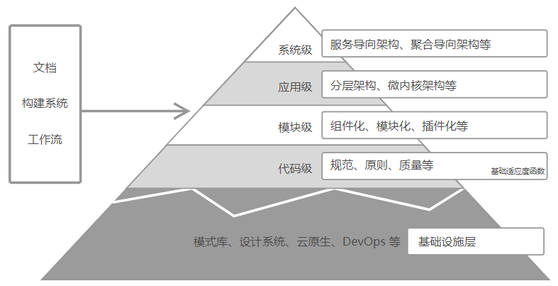 一个软件系统是由一系列的应用组成的,而一个应用则由一系列的模块组成,进一步的模块是由代码组成的。举个示例,一个现代的系统是由一系列的后端服务、客户端应用组成的;拆解开一个微服务,则是由一系列的模块组成的。