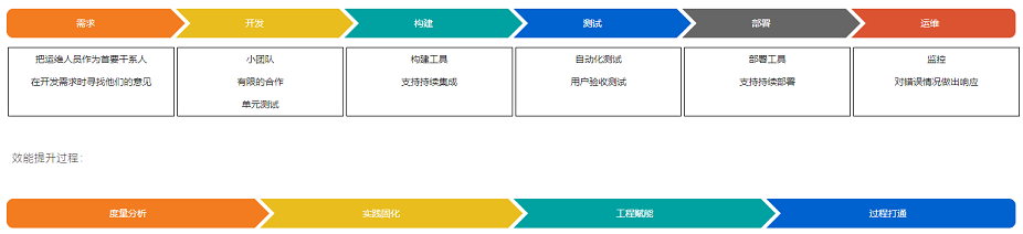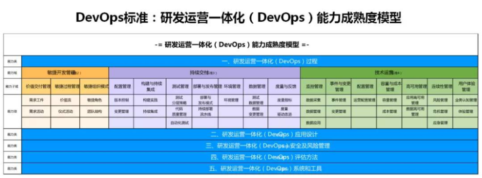 对于信通院发布的DevOps能力成熟度模型还是可以作为一个重要的参考标准。该系列标准分为敏捷开发管理、持续交付、技术运营、应用设计、安全风险管理、组织结构及系统和工具等部分,涵盖了软件开发到运维的全生命周期,如下图: