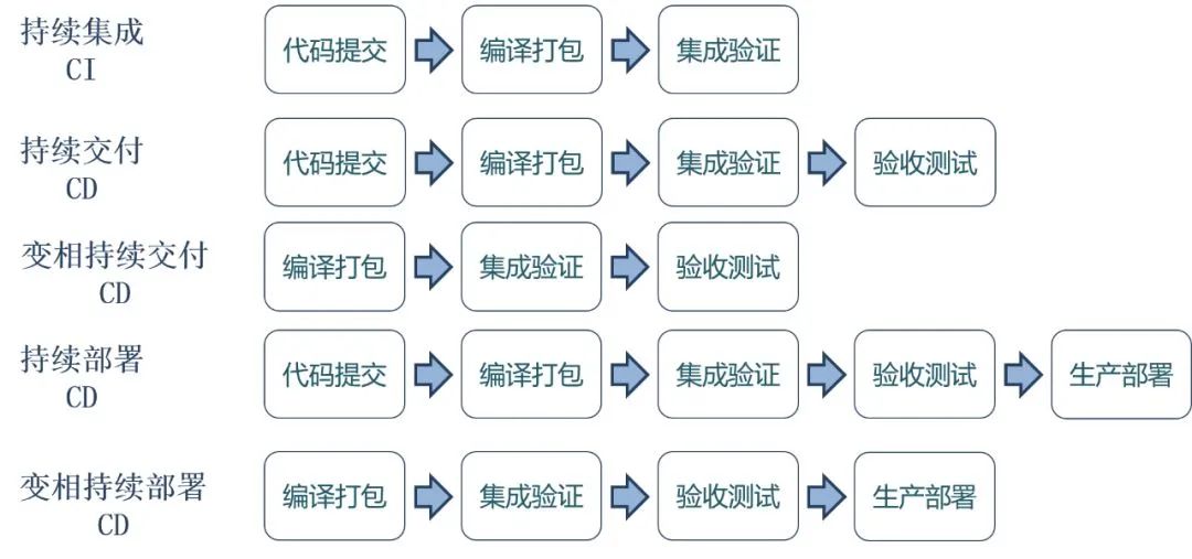 - 但项目中,有可能变通为从编译打包到生产部署的过程