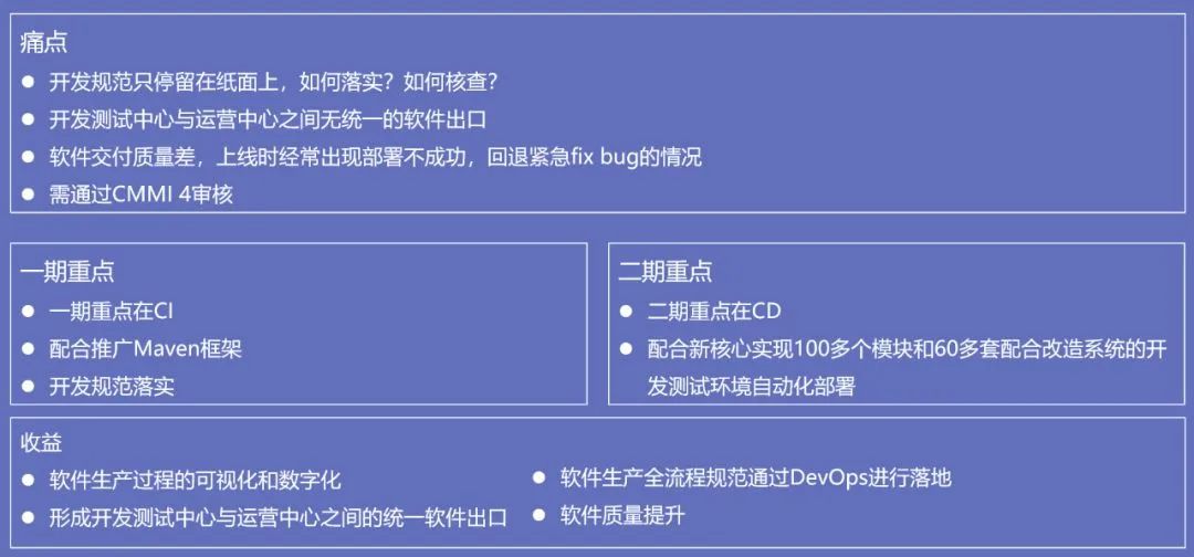 我们看看中国银行的案例在实践阶段分了三步走,研发层面的持续集成、运维层面的持续交付,最终打通研发和运维实现DevOps全流程。