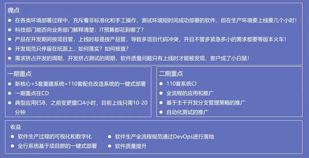 这是一家地方商业银行,也是因为今年要上新核心,并且伴随新核心,有5个系统要重新建设,110套系统要配套改造,行领导提出的目标:在9月8日上线时,利用DevOps做一键式的统一部署!所以项目一期的重点就放在了CD上,短期目标是满足110多套系统的短期大量版本的提测后的自动化部署,最终目标,是要将1+5+110这些系统能够可视化的一键式部署。项目的二期重点,是在CI,配合诸多研发管理的落地实施,全流程的应用和推广以及自动化测试的接入。