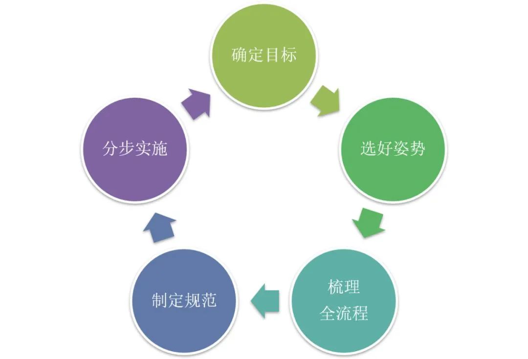 套路我总结了五步:确定目标、选好姿势、梳理全流程、制定规范、最后分步实施。我们细看一下这五步: