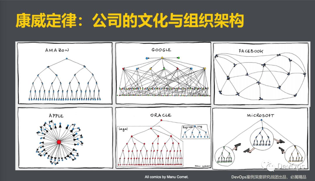 康威定律也是我们在谈论组织变革的时候经常谈到的,简单来说,就是:有什么文化就有什么组织结构,有什么组织结构就有怎样的系统架构。