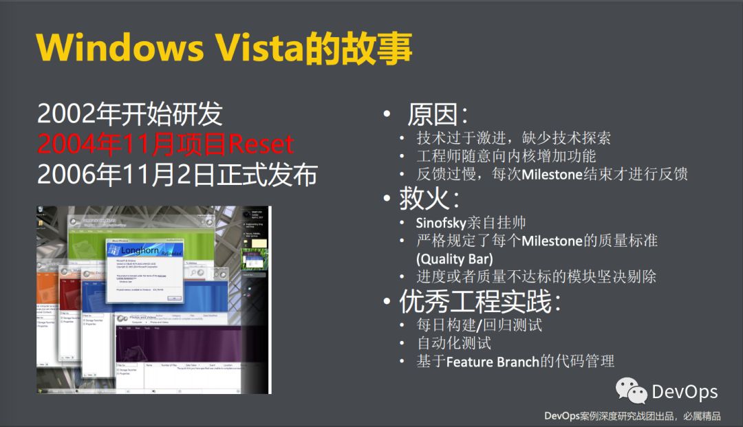 当时参与项目的工程师在安装了前一天的daily build之后,发现整个产品恢复到原来XP的样子,所有人都被吓呆了,以为系统出了问题。但当他们联系总部的工程师后才得知,原来是由于整个产品运行过于缓慢而被整体重置。当时的Windows开发工程师过于追求技术上的先进性,在内核中添加了太多的功能,使得整个系统运行极其缓慢,不得不推倒重来。