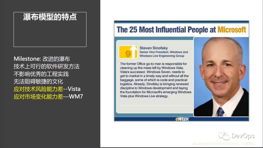 这里不得不提到一位大神级人物Sinofsky,因为就是他叫停了不断变得臃肿的Vista,让这个产品可以最终上市;也是他在暴怒的鲍尔默面前力挽狂澜,才使得Windows Phone 7可以最终面世。虽然这些都阻挡不了这两款产品位列微软最失败产品的首位,但我们也同样不能忽视微软在开发这两款产品的过程中的优秀工程实践。