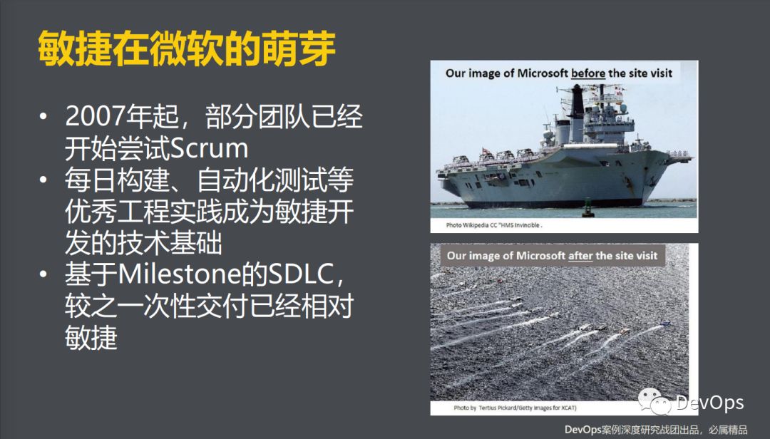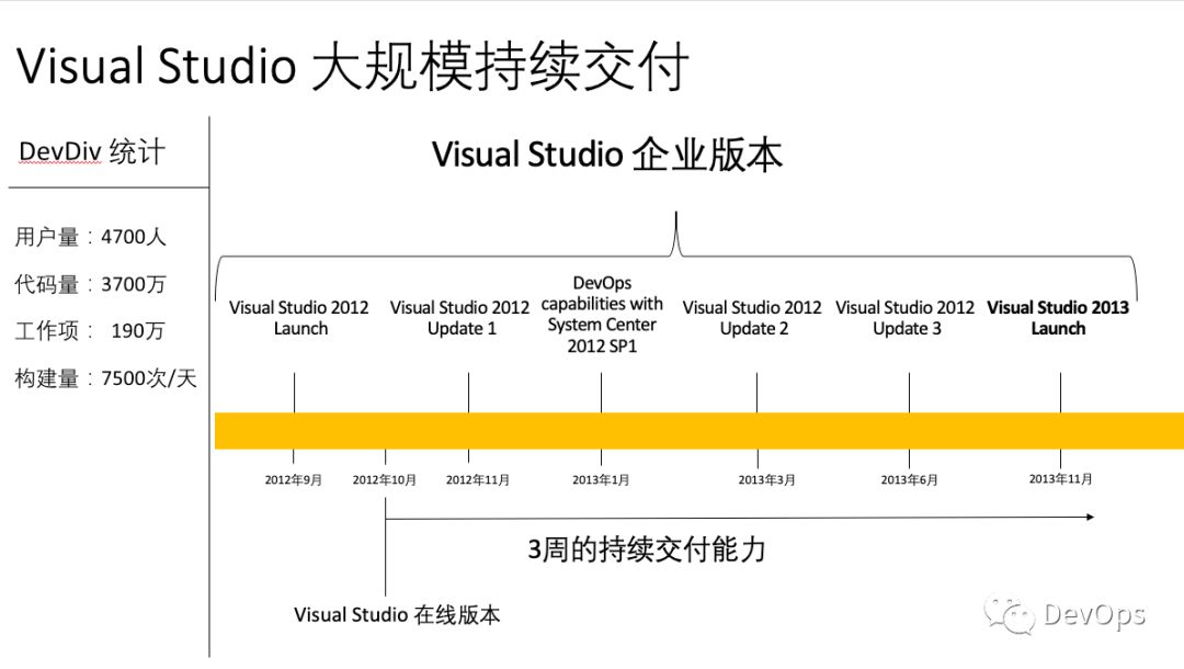 你需要知道的是,VS团队有近5000名开发人员,整个产品完成一次Full Build需要8个小时的时间,在这样规模的产品上将发布周期从2-3年降低到3周,这样的敏捷转型无论是从管理流程上还是工程实践上都是巨大的考验。