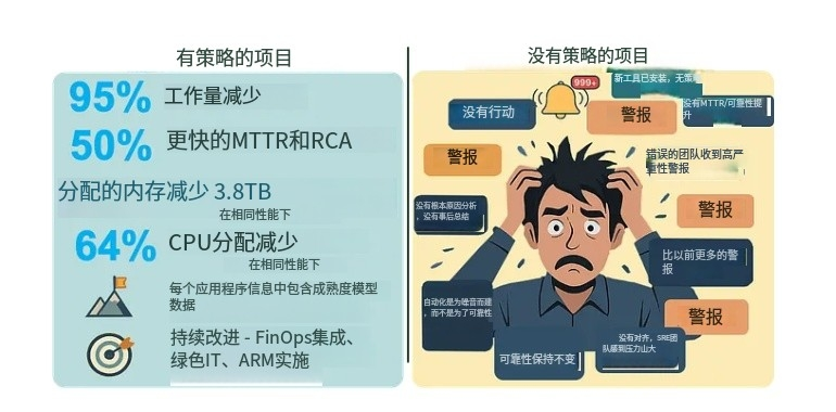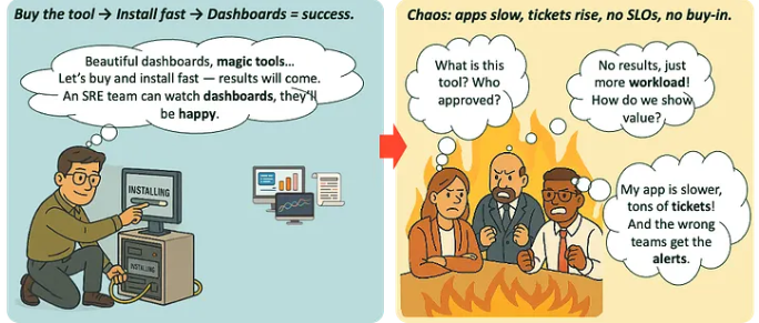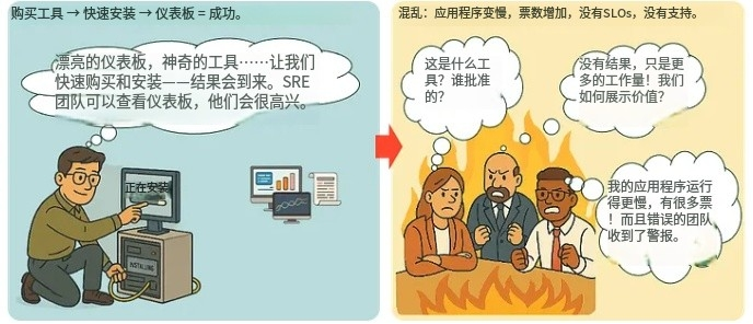 在实践中,许多组织创建了一个SRE或可观察性团队,快速选择一个评估最少的工具,并期待结果。如果没有战略,结果是可以预测的:团队不一致、门票量上升、另一种管理工具,甚至是旨在减少这种情况的解决方案所带来的新麻烦。