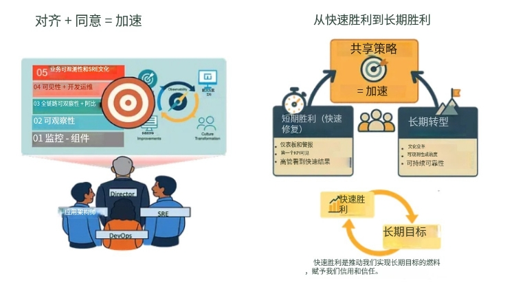 想一想,你们中有多少人参加过SRE或可观察性项目,领导要求快速取得成果?了解可观察性也是一段旅程。那么,如何实现短期胜利和可持续成果呢?另一个秘密因素:结盟+买入。战略和设计是至关重要的,但一致性可以成就或破坏一个项目。