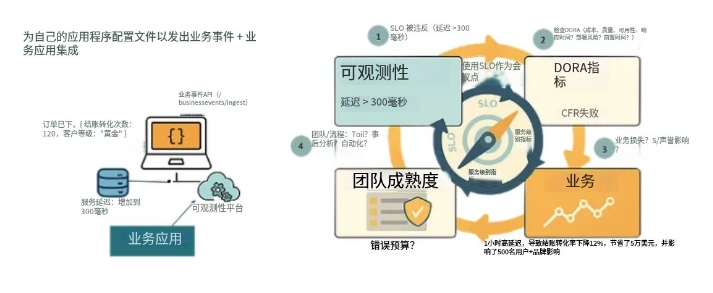 在右侧,SLO充当所有这些度量的交汇点,分为四个领域:可观察性度量、DORA度量、业务度量和团队成熟度度量。