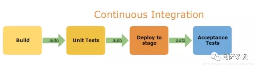 持续集成 CI(Continuous Integration)。它指开发频繁地(一天多次地)提交代码到主干或者共享库里。开发先提交代码到主干上,编译,运行自动化测试,生成可部署的软件包。这所有过程都是自动化运行的。
