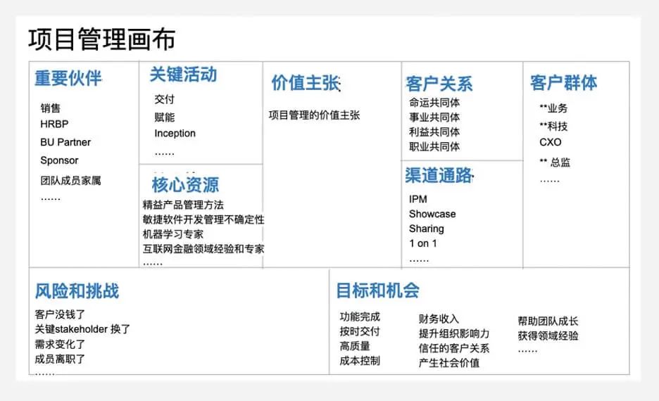这个阶段推荐项目管理者使用项目管理画布(具体的使用方法的方式在这篇文章有描述: 好的开始是项目成功的一半,试试项目管理画布)把所有相关的信息进行整理和拉通,确保所有团队成员在团队目标和个人任务之间建立联系,快速开展工作。